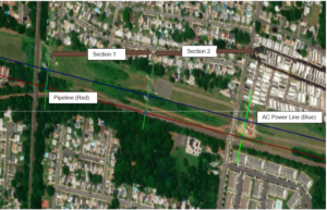 Below are two (2) pipeline sections represented of a 15-mile long pipeline. AC power transmission line and pipeline sections were created in less than 20 minutes using the GIS function of the ACPT. Once created, automatic calculations can start the process of analysis. Note, point and click must be across all lines unless they depart from the right of way and they must start on one side of the pipeline and or tower i.e. cannot be mixed, one way only. Soil resistivity and depth of cover data are imported once sections are determined.