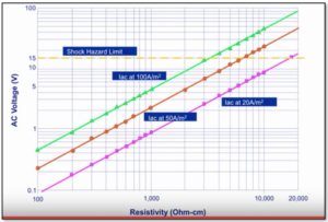• AC voltages as low as 1 VAC can produce high current densities at 1 sq. cm (0.01128) holiday in lower resistivity areas.