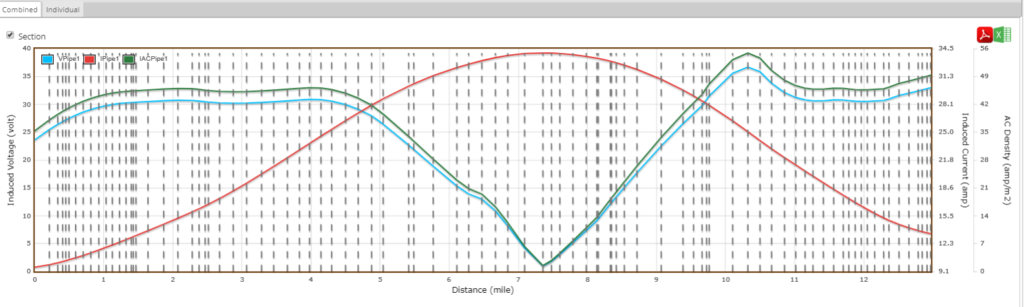 The ACPT model produced the type of results that would be expected from this type of collocated pipeline and HVPL corridor. The length of the parallel configuration, the proximity between the pipeline and HVPL, the 2300 ohm-cm soil resistivity, and the new FBE pipeline coating are all significant contributors to the modeled AC voltage and current. Steady State condition calculated and modeled a maximum of 32 volts AC at the ends of the pipeline which exceeds the 15-volt safety limit.