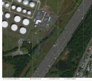 On the next page is a linear copper grounding system (Dashed Blue Lines) with a decoupler located at a fault area (Orange Dot). By using the ArcGIS map in conjunction with planning the type of mitigation that can be installed allows the designer to make faster engineering assessments to mitigate the effects of the AC fault voltage peaks and high AC current.