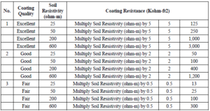 Note: Not shown above. In low resistivity soils below (2.5 ohm-m) with poor coating quality, to estimate coating resistance values use a multiplier of 0.1. Example 2.5 ohm-m x 0 .1 = 0.25 Kohm-ft2. These are estimates and it is recommended to electrically test for actual coating resistance values.