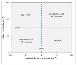 • Where AC current density is above 100 A/m2 the likelihood of AC corrosion can occur. It can also occur at lower values based on DC current density and other factors. Most engineers agree that at less than 30 A/m2 it does not occur. Below is a graph showing another version of the above graph with multiple ranges.