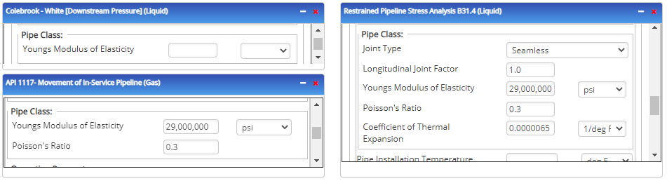 The pipe class directive is used in all widgets that perform analyses where joint type and behavior of the steel as a function of its environment, aside from SMYS, matters. This includes parameters like thermal expansion, elasticity, Poisson’s Ratio, and others.