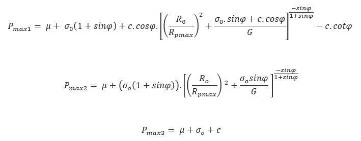 The cavity expansion model can be used to calculate the estimated maximum allowable drilling fluid pressure in a borehole. The risk of hydrofracture can be evaluated by calculating the maximum allowable pressure with the following cavity expansion equation (often referred to as the Delft Equation). The minimum required pressure needs to be considerably lower than the maximum allowed pressure to reduce the chance of hydrofracture.